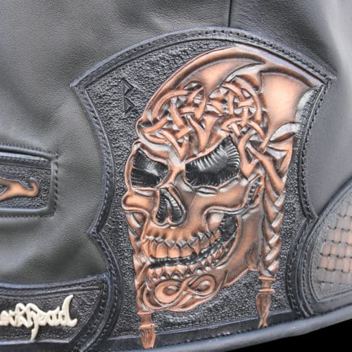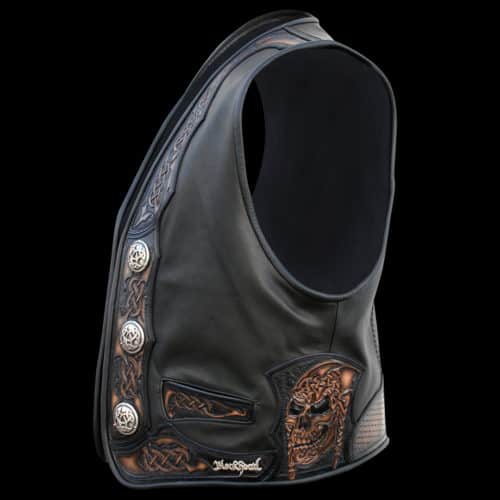 Diese Weste ist eine klassische Viking Weste. Die Färbung der Muster ist in „Stone brush“ Technik ausgeführt. 6 Silber Conchos mit schönen Triskelen Knoten rundet das ganze ab. An der Seite ist ein Viking Skull mit geflochtenen Zöpfen eingearbeitet ! Harald Schönhaar hätte seine freude ghabt an dieser Schönen Arbeit.
